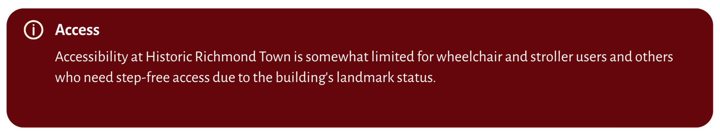 Some of Historic Richmond Town’s programs and events take place in our historic buildings. Please visit our website and view the Calendar of Events to check accessibility before purchasing tickets.